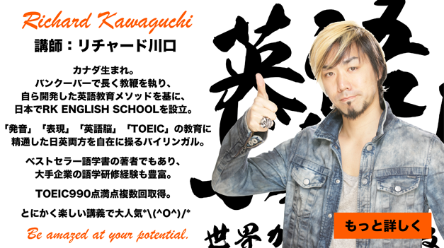 ![法人向けトレーニングもRK Englishにおまかせ! [RK X COMPANY] リチャード川口による 発音・表現・英語脳・TOEIC・プレゼン対策・ビジネス英語の企業研修、大学講演サービス](/wp-content/uploads/2015/09/RKXC-Corporate-Use-Button.png)