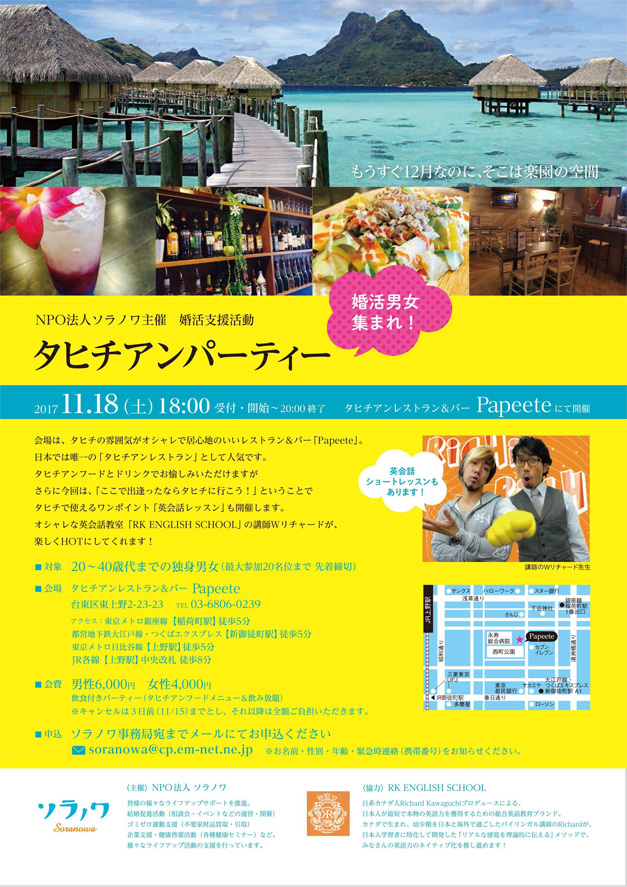 会場は日本で唯一のオシャレなタヒチアンレストラン&バー “Papeete”。RK Englishがからんでいるということは……そう今回の婚活パーティー、なんとおいしいタヒチアンフードやドリンクだけでなく、100%タヒチ!ということで英語を使って学べる楽しいゲームやワンポイント英会話レッスン付きなのです!