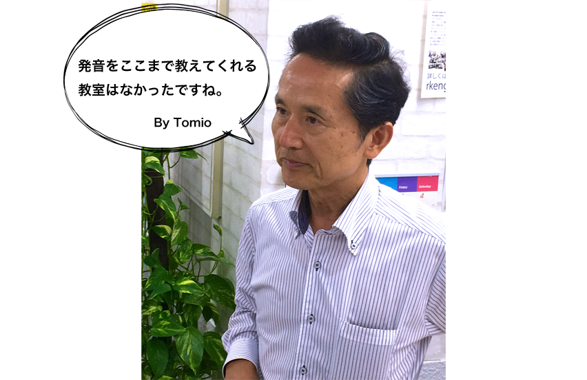 Tomio: 実際に来て、体験をすることが大切だと思います。長期で英会話に行っていましたが、発音が全然わかりませんでした。先ほども話しましたが、英語で映画をみるときも聞き取りができませんでした。でも、発音を学ぶことで少しずつ聞こえるようになってきています。他では発音をここまでわかりやすく教えてくれないのでオススメです。